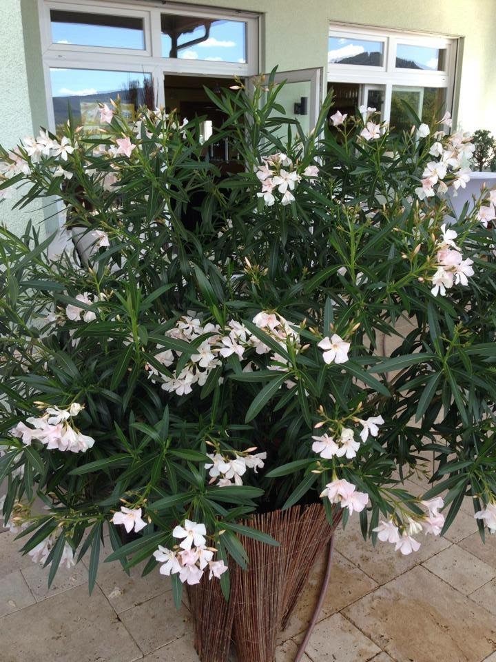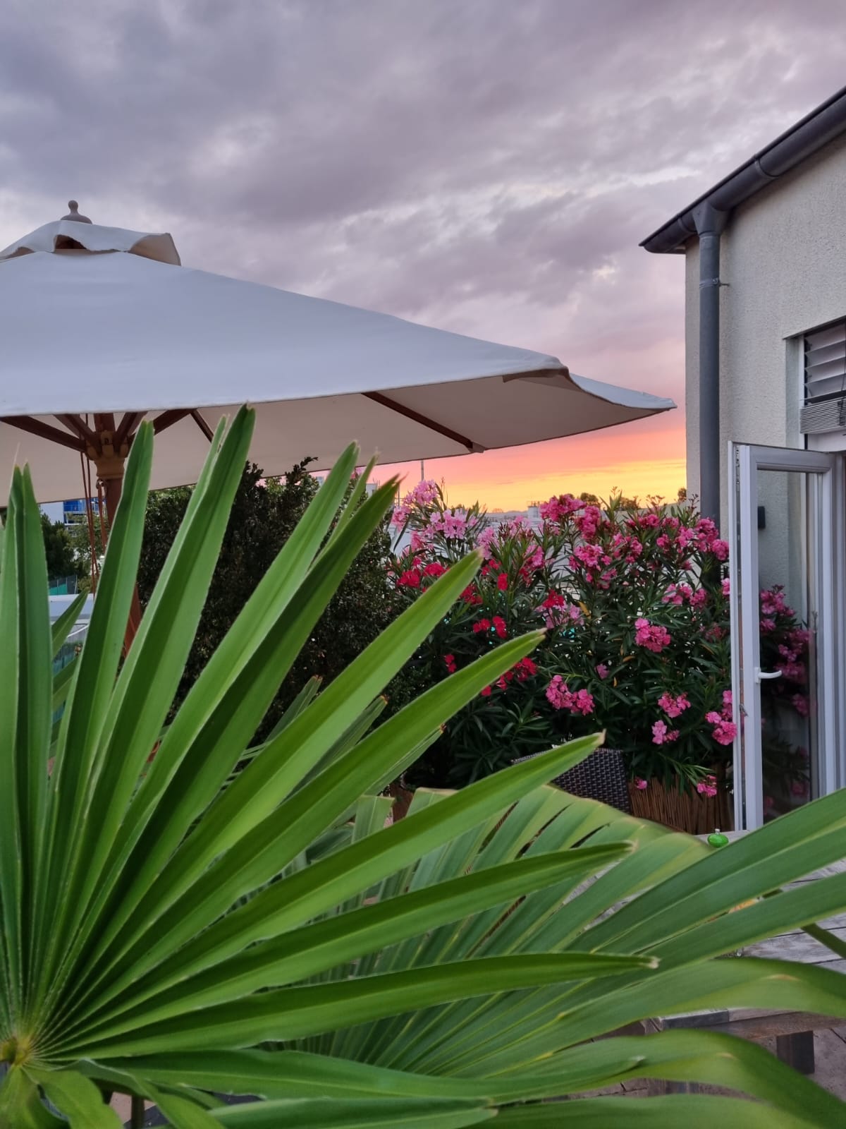 Unsere weitläufige grüne Terrasse bietet ausreichend Sonnen- und Schattenplätze. Mit ihrer schönen Aussicht ist sie bei unseren Gästen besonders beliebt. Zwischen immergrünen Oleandersträuchern und exotischen Palmen kommen hier Feriengefühle auf.